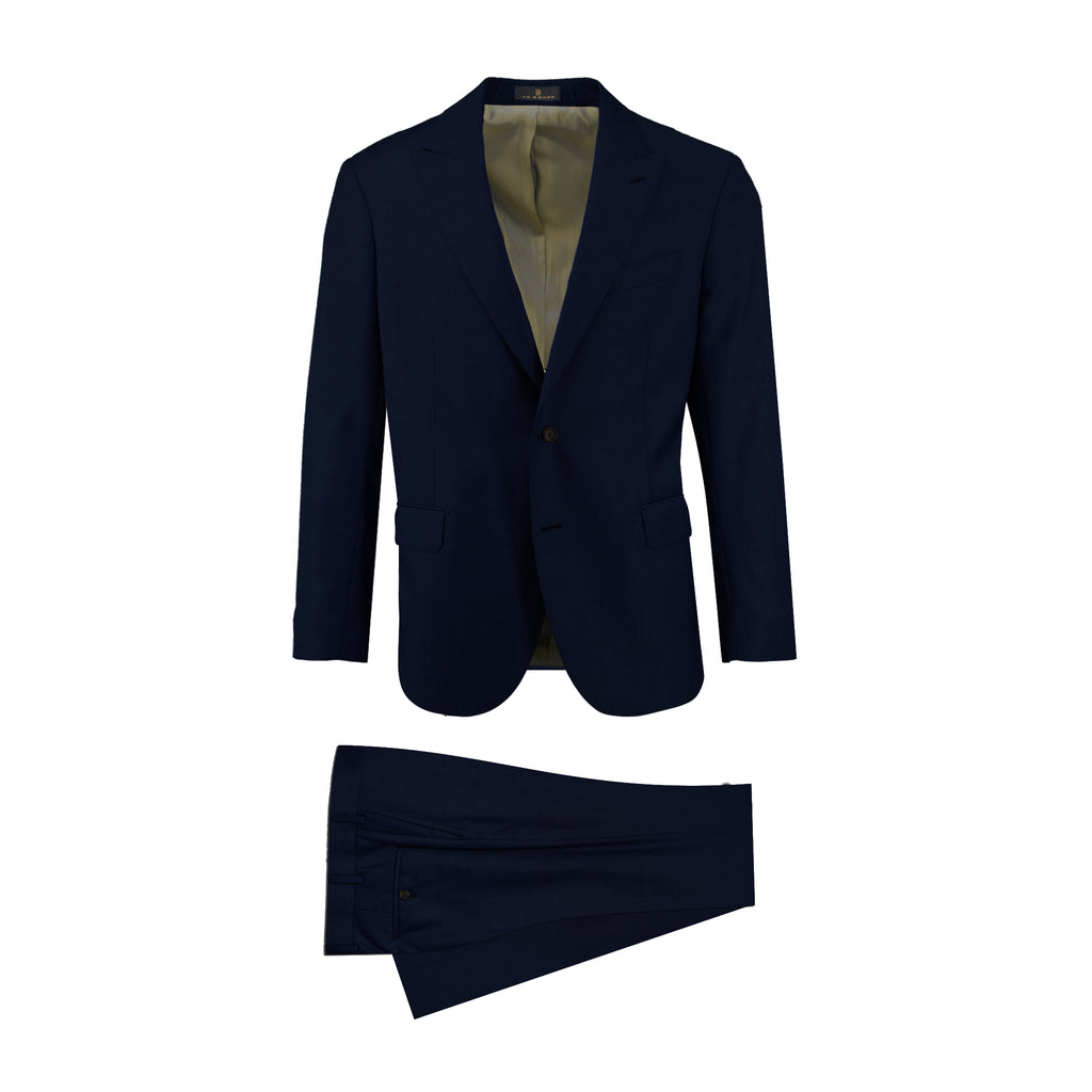 Crafted with the finest Italian fabric from Loro Piana, this suit exudes elegance and luxury. Handmade in Canada from 100% Super 150's Wool, it will elevate any look with its stylish peak lapel and sophisticated navy hue.